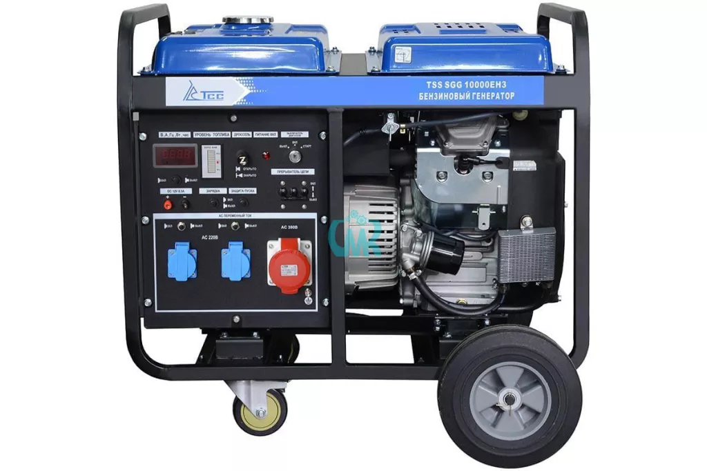 Бензогенератор трехфазный 10 квт TSS SGG 10000 EН3 (с электронным запуском) предназначен для выработки электроэнергии с основными характеристиками: напряжение 220-380 вольт, частота 50 Гц и номинальной мощностью 10 кВт, оснащенный колесным комплектом и ручками, для удобства передвижения. Трехфазный бензиновый генератор с мощностью 11 кВт не только отлично справится с созданием резервного электропитания в случаях отключения электроэнергии, но и гарантирует стабильную работу в качестве главного источника питания, при условии необходимости подключения трехфазных 380 В потребителей. Российский трехфазный бензогенератор может применяться в автосервисе, строительстве, аварийными службами, а так же на предприятиях малого бизнеса, для подключения бытовых приборов или строительного инструмента. К примеру, в автосервисе можно подключить трехфазный компрессор для работы автоподъемников, в моменты отключения электроэнергии. Электрогенератор бензиновый работает на бензине АИ-92. Рекомендуемое к эксплуатации масло SAE 10W30. Необходимо учитывать, что схема соединения "Звезда" используемая в трехфазном бензогенераторе ТСС, позволяет, при подключении нагрузки к однофазному разъему 220В, получить полезную снимаемую мощность всего 3,3 кВт.