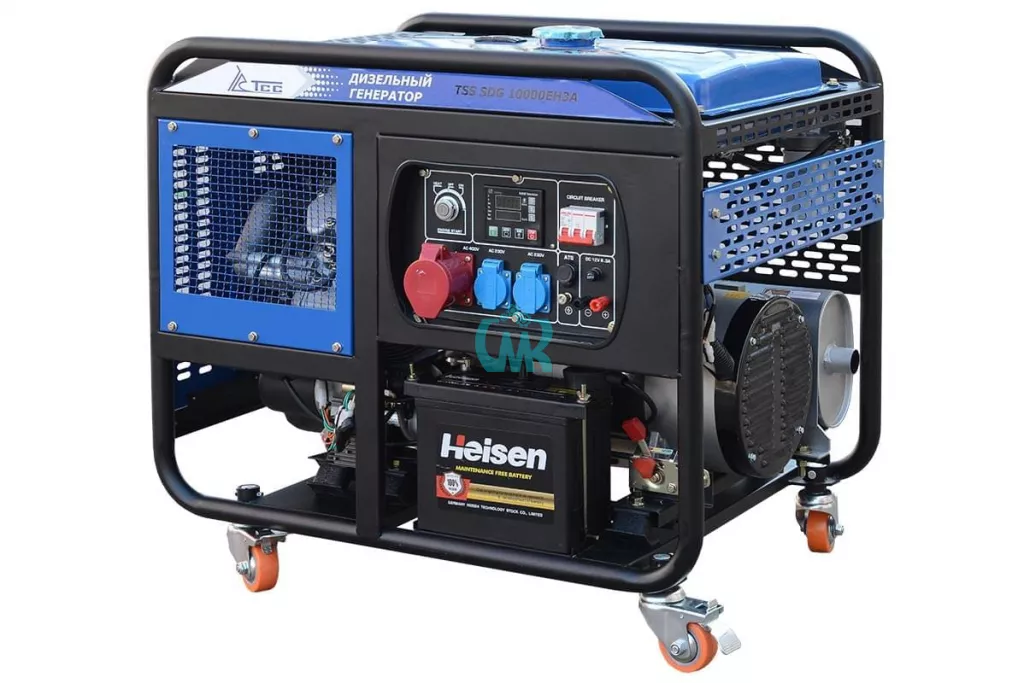Дизель генератор TSS SDG 10000EH3А с надежным и экономичным двигателем, электростартером и разъемом для подключения блока АВР. Для удобства передвижения оснащенный колесным комплектом.