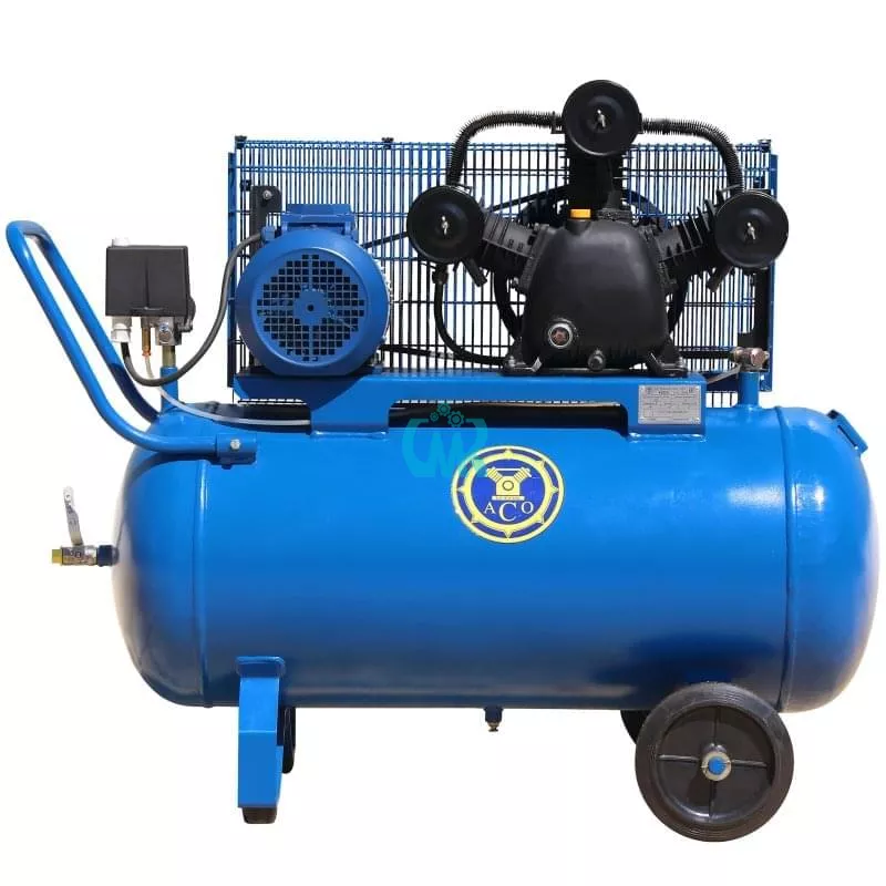 Поршневой компрессор К550/8 Бежецкого завода АСО с производительностью на входе 550 л/мин, производительность по нагнетанию составляет 350 л/мин. Трехфазный электродвигатель мощностью 3 кВт напряжением 380 В вращает поршневую головку через ременную передачу. Натяжение ремней производится перемещением двигателя с помощью регулировочных болтов, передача имеет сетчатое ограждение. Сжатый воздух от компрессорной головки к ресиверу подается по воздуховоду. Управление давлением осуществляется с помощью реле Condor MDR. Компрессор закреплен на воздушном ресивере объемом 120 л. Размеры 117 х 55 х 98 см, масса 115 кг.